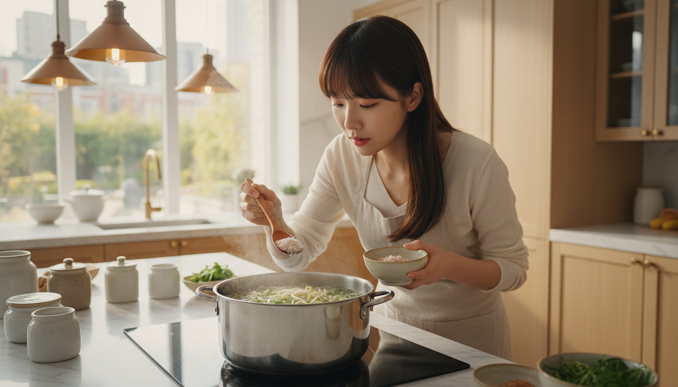 여기서 저의 비법은 바로 '새우젓'입니다. 새우젓 1큰술을 넣으면 해물 육수를 낸 듯 감칠맛이 폭발하고, 소화도 잘 되게 도와줍니다. 새우젓으로 기본 간을 하고, 부족한 간은 소금으로 마무리해 보세요. 정말 다른 조미료가 필요 없답니다.