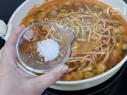 이제 콩나물국 맛있게 끓이는 법의 하이라이트, 간을 맞출 차례입니다. 소금으로만 간을 하면 깔끔하긴 하지만 깊은 맛이 부족하고, 국간장을 많이 넣으면 국물 색이 탁해져서 보기 좋지 않습니다.