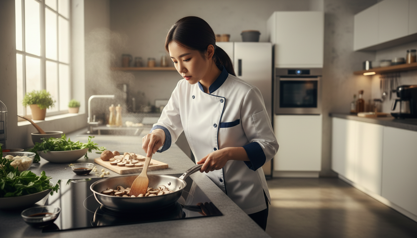 2. **버섯과 고기:** 표고버섯을 볶은 뒤, 밑간해둔 고기를 볶습니다. 고기는 센 불에서 빠르게 익혀야 육즙이 빠지지 않고 누린내가 나지 않습니다.
